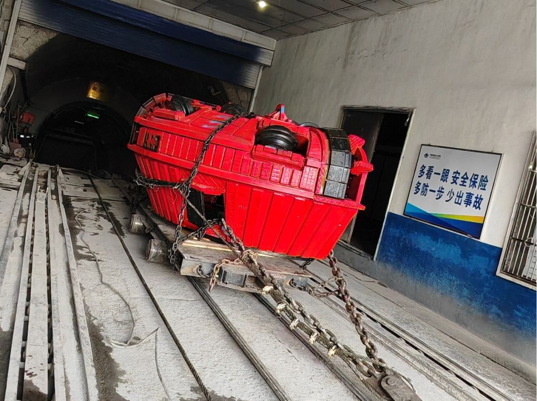 EQS3660组合式盾构掘进系统在天地王坡属于首次使用,由于其各单元件体积较大,受运输条件所限,其入井下放运输工作是一个新的挑战。为了确保工作的顺利进行,天地王坡运输队组建了一支由技术人员和经验丰富的操作人员组成的团队,全力以赴投入到这一工作中。在整个过程中,大家紧密协作,克服了各种困难和挑战,最终以出色的表现圆满完成了任务。盾构系统主驱动和刀盘等部件由于尺寸较大,受副斜井断面及轨距所限,正常情况下无法下放。运输队积极寻找解决方案,跳出固有思维,勇于创新,量身打造了专属下放方式,以满足盾构系统大尺寸设备件的下放要求。为了确保方案的可行性,进行了一系列模拟和试验,通过电脑CAD模拟,成功模拟了大尺寸部件在副斜井中的下放过程,验证了方案的有效性,并组织技术人员进行了详细的现场调查和评估。同时制作了等比例模型进行了现场试验,找出了模型实际下放过程中存在的问题,及时进行了处理,保障了盾构系统能够安全顺利的下放入井。