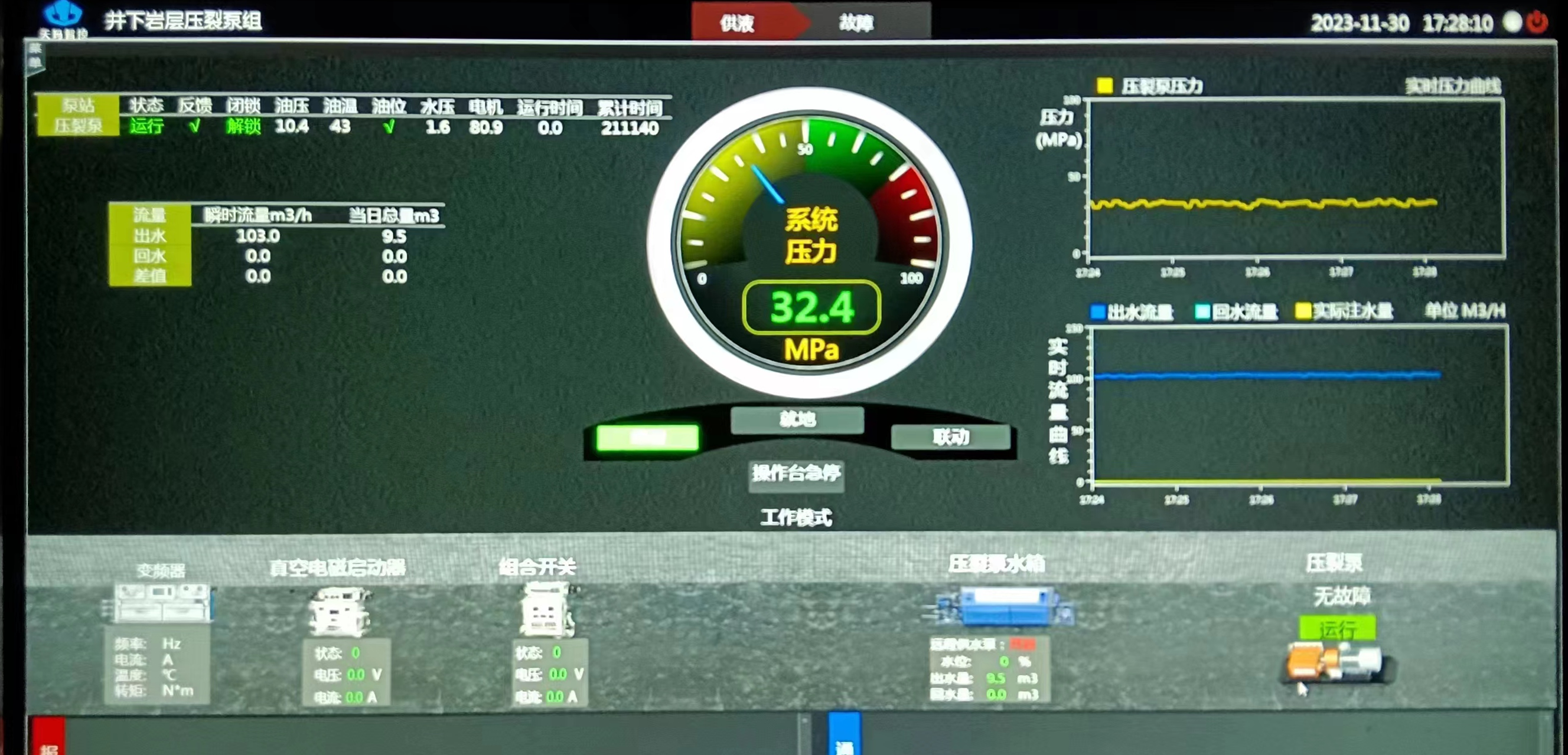 天玛智控1000kW压裂泵系统采用变频驱动的总体设计方案,以模块化、易维护、低噪声的设计理念,解决了现有压裂泵系统制动功率小、压力低、施工作业时间长等问题,满足了煤矿井下安全治理对大流量、高压力压裂泵系统需求。“我进行煤矿压裂施工这么多年,还是第一次进行这么大流量的压裂施工,这套1000kW压裂泵流量大、噪音低、操作简单、智能化程度高,为我们122104工作面水力压裂施工提供了保障,加快了施工进度。”该工作面压裂施工负责人说。