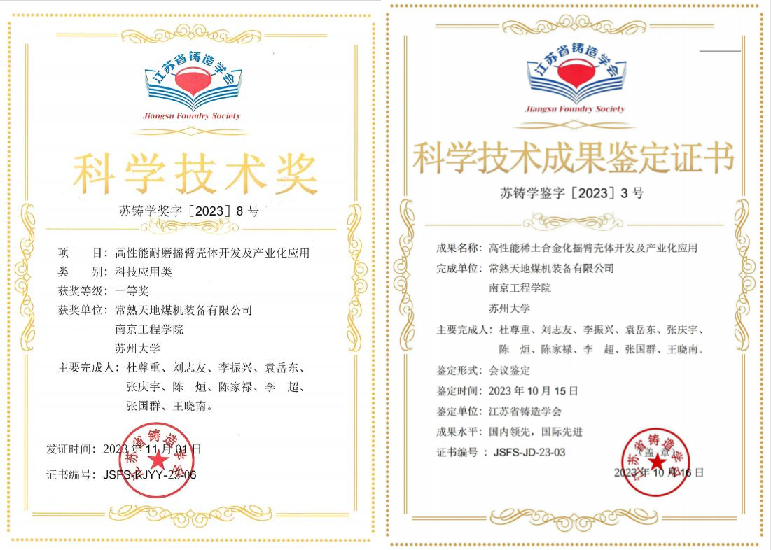 近日,2023年江苏省铸造学会科学技术奖颁奖仪式在江苏江阴顺利召开,上海煤科常熟煤机(以下简称上海煤科常熟煤机)“高性能耐磨摇臂壳体开发及产业化应用”项目荣获江苏省铸造学会科学技术一等奖,达到国外知名品牌同类产品的水平。该项目研发了一种含稀土铸钢新材料及相关工艺,已应用于天地上海采掘装备科技有限公司(以下简称天地采掘)大功率采煤机,实现了国产煤机替代进口煤机的目标,取得了显著的经济、社会和环保效益。