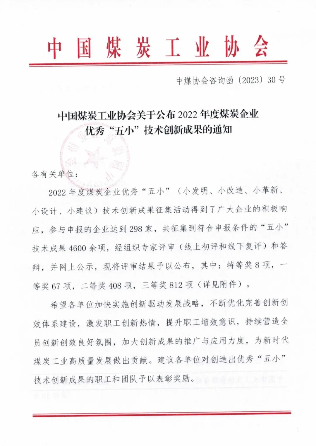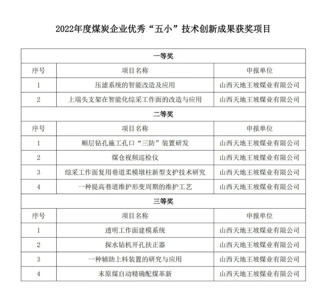 近日,中国煤炭工业协会公布了2022年度煤炭企业优秀“五小”技术创新成果名单,天地王坡共10项成果获奖,其中一等奖2项,二等奖4项,三等奖4项。
