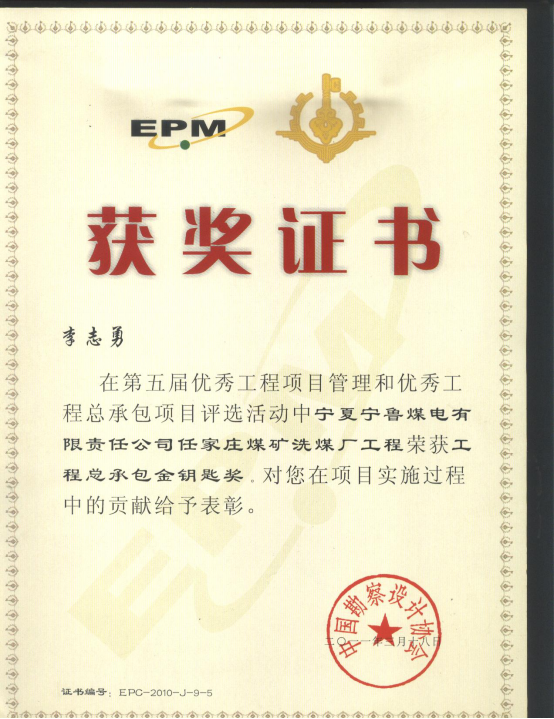 1.宁夏宁鲁煤电有限责任公司任家庄煤矿选煤厂获中国勘察设计协会“总承包金钥匙奖(国家一等奖,2011年)”、“煤炭行业第十五届优秀设计一等奖” 、中国煤炭建设协会“总承包金钥匙奖(行业一等奖,2010年)”