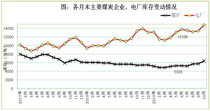 (三)全社会库存总体处于较高水平。据快报统计,10月末,重点煤炭企业库存6400万吨,环比增加650万吨,增长11.3%;比年初5500万吨增加900万吨,增长16.4%;同比增加981万吨,增长18%。全国统调电厂存煤14445万吨,处于历史高位,环比增加1028万吨,增长7.7%;同比增加1053万吨,增长7.9%,存煤可用30天,处于较高水平;环渤海主要港口存煤2619万吨,环比增加272万吨。