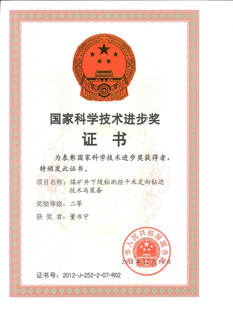 2.2012年国家科技进步二等奖--煤矿井下随钻测控千米定向钻进技术与装备,排名第2;