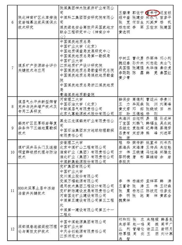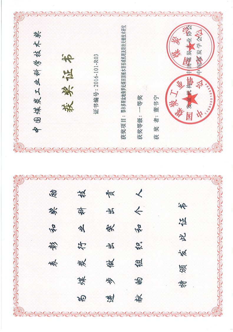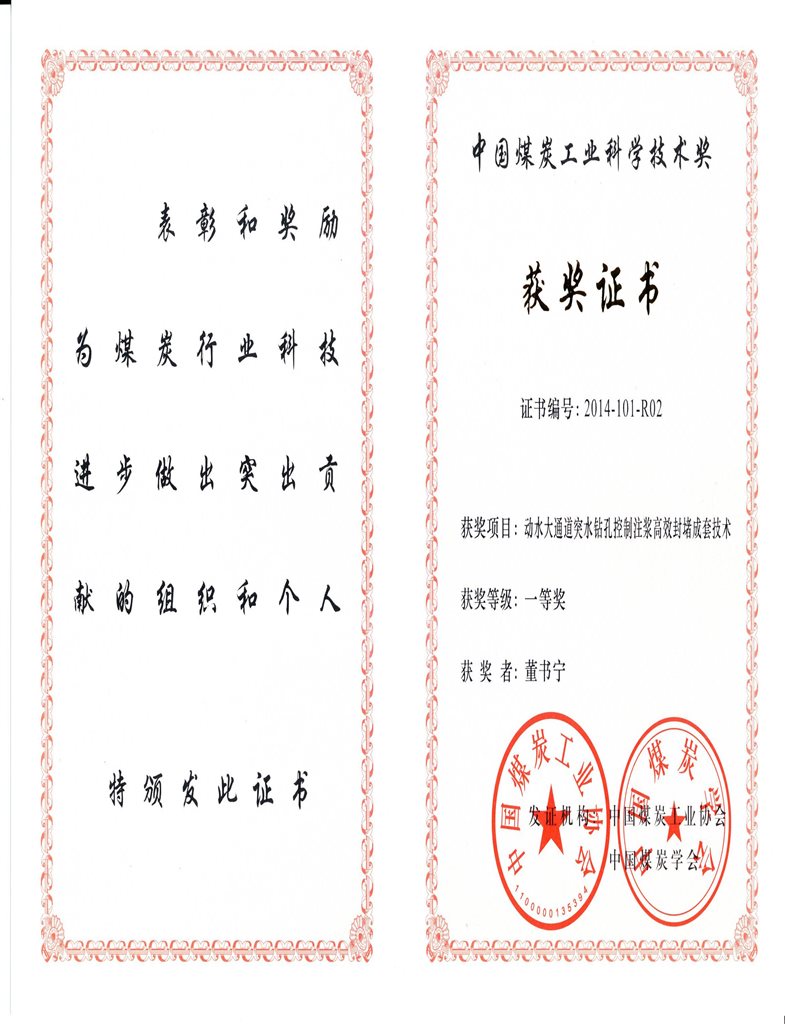 11.2014年中国煤炭工业科学技术一等奖--动水大通道突水钻孔控制注浆高效封堵成套技术,排名第2;
