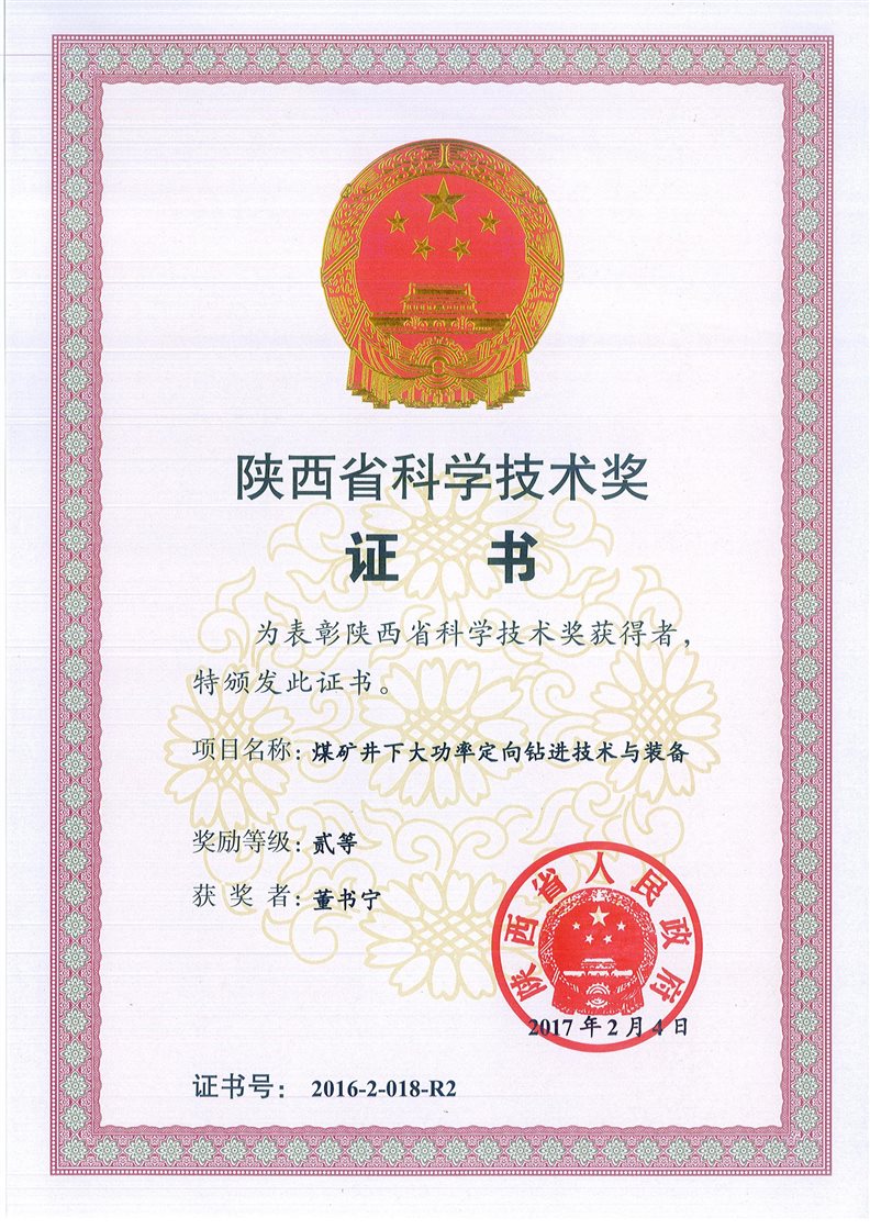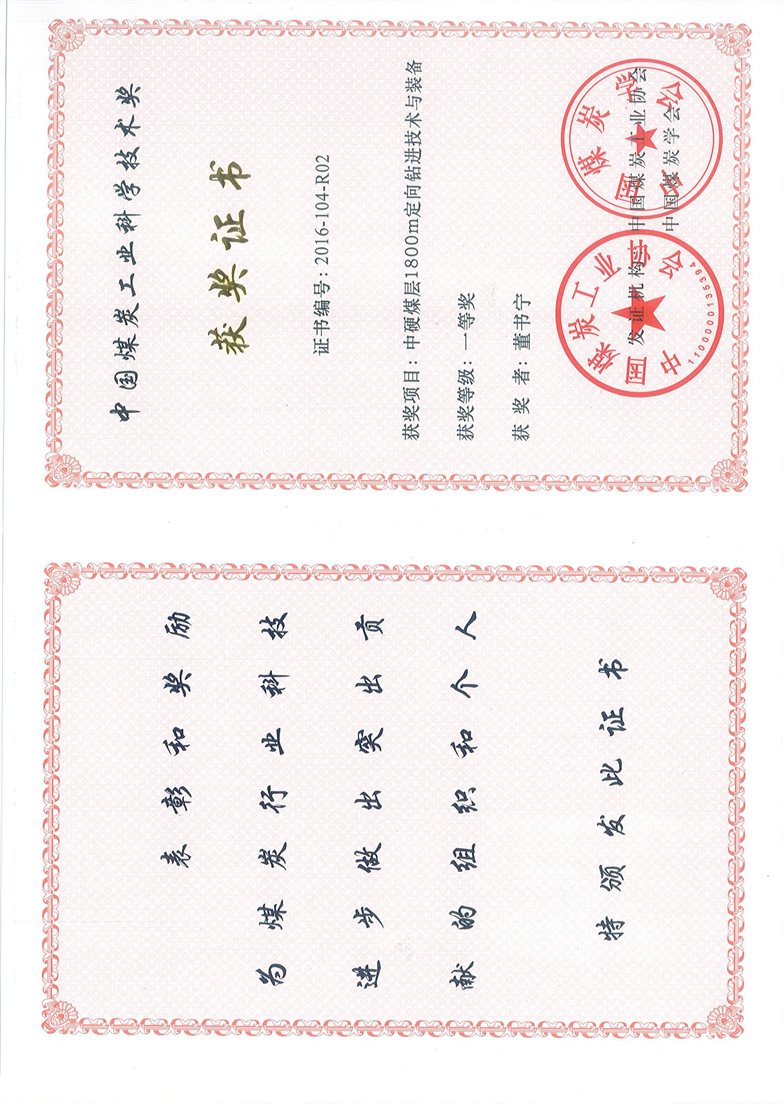 4.2016年中国煤炭工业科学技术一等奖--中硬煤层1800m定向钻进技术与装备,排名第2;