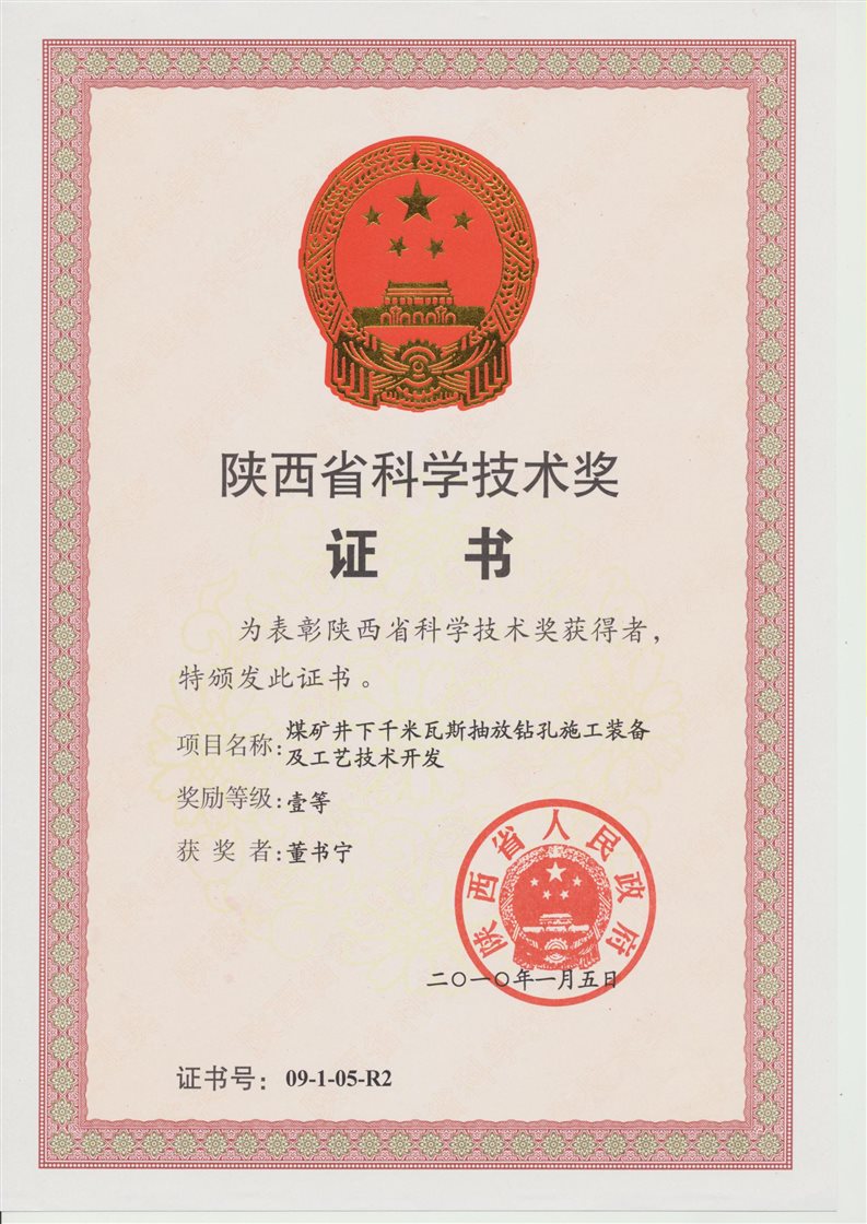 13.2009年陕西省科学技术进步一等奖--煤矿井下千米瓦斯抽放钻孔施工装备及工艺技术开发,排名第2;