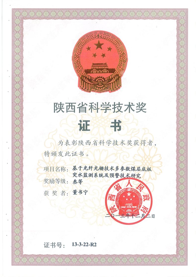 25.2013年陕西省科学技术进步三等奖--基于光纤光栅技术多参数煤层底板突水监测系统及预警技术研究,排名第2;