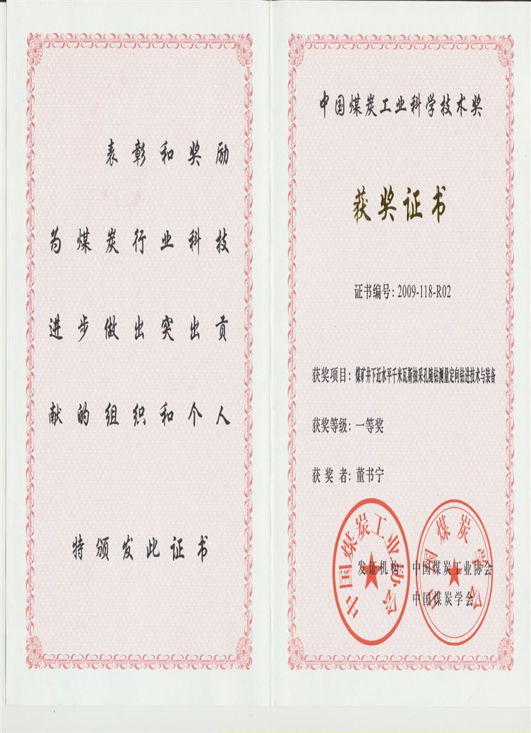 14.2009年中国煤炭工业科学技术一等奖--煤矿井下近水平千米瓦斯抽采孔随钻测量定向钻进技术与装备,排名第2;