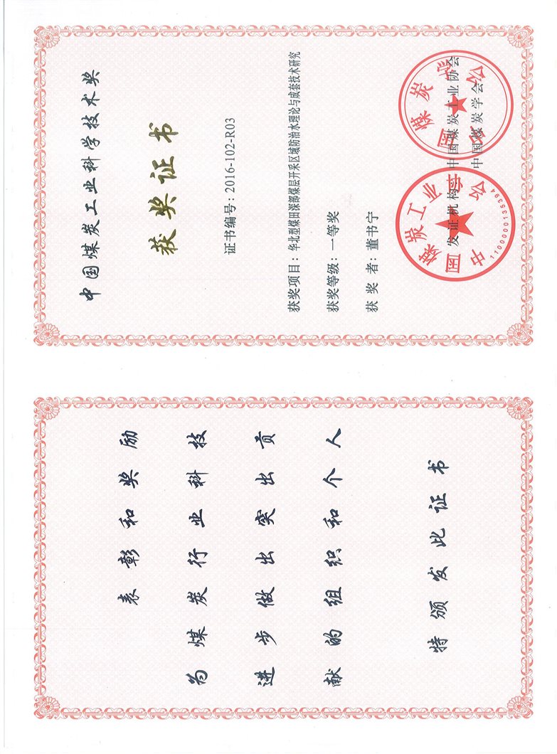 5.2016年中国煤炭工业科学技术一等奖--华北型煤田深部煤层开采区域防治水理论与成套技术研究,排名第3;