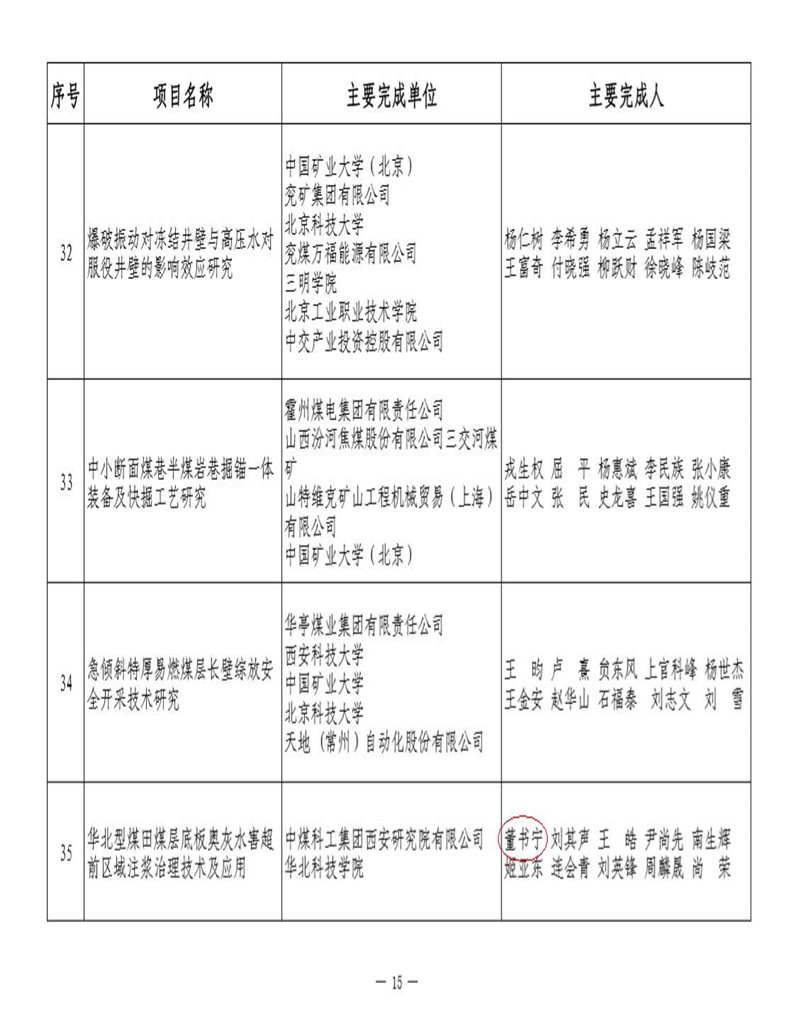 23.2014年中国煤炭工业科学技术三等奖--煤矿井下水害防治与地质异常体探查定向钻进技术研究,排名第2;