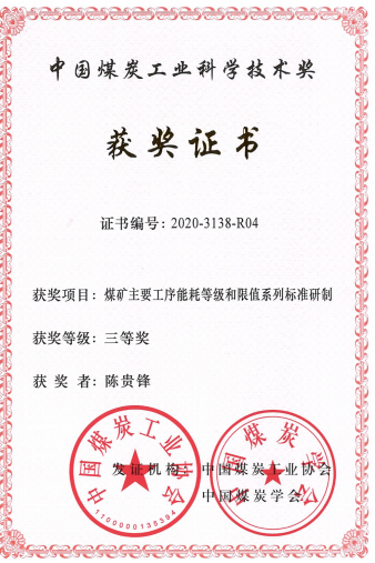 1、煤矿主要工序能耗等级和限值系列标准研制2020年,中国煤炭工业科学技术奖三等奖