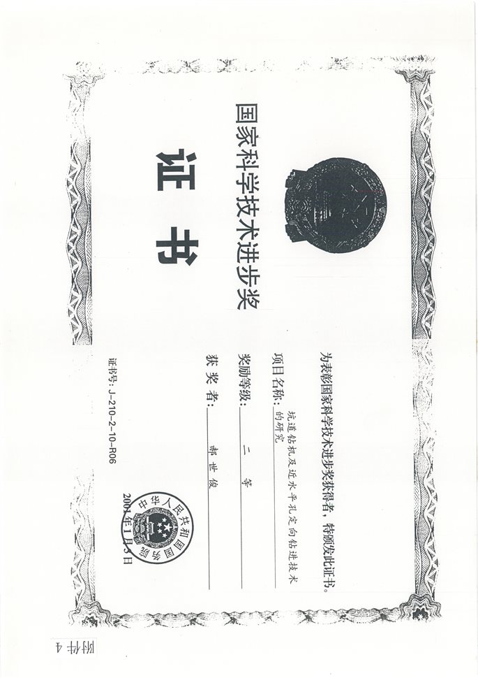 (3)坑道钻机及近水平孔定向钻进技术的研究,国家科技部,国家科学技术进步奖,二等奖,2001年,排名第6