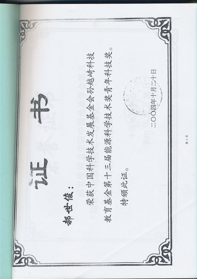 (2)2004年获得第十三届孙越崎能源科学技术奖青年科技奖