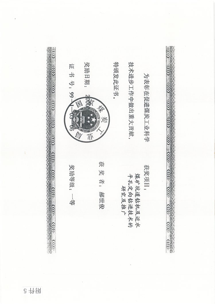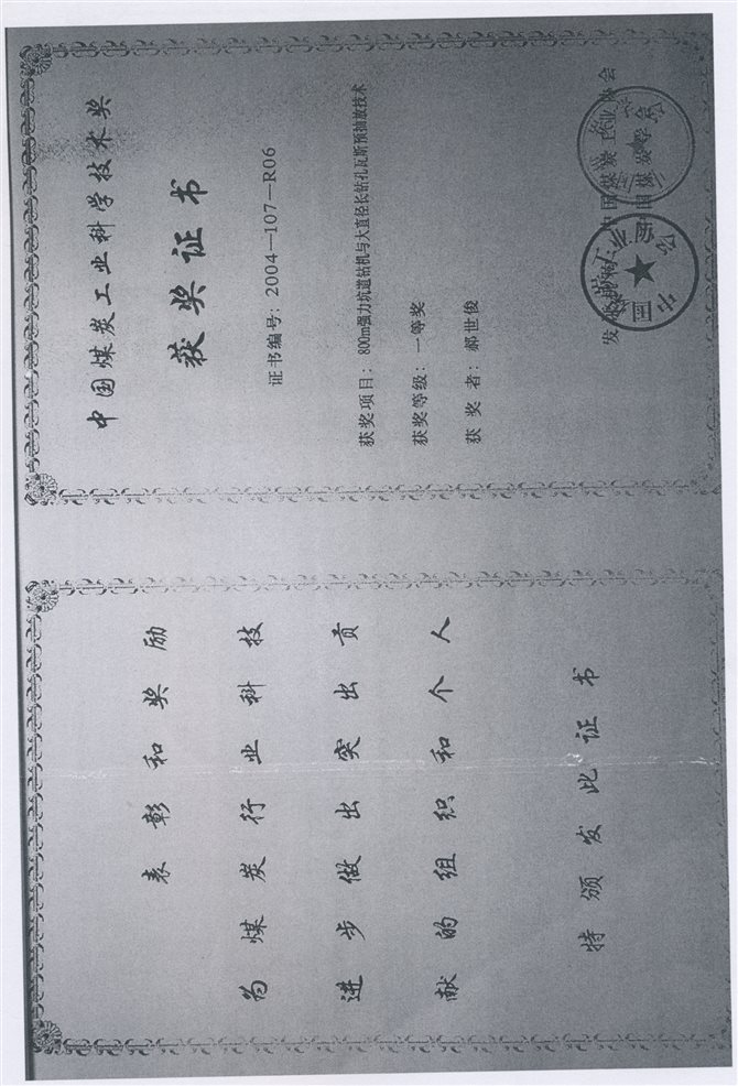 (7)800m强力坑道钻机与大直径长钻孔瓦斯预抽放技术,中国煤炭工业协会,中国煤炭工业协会科学技术奖,一等奖,2004年,排名第6