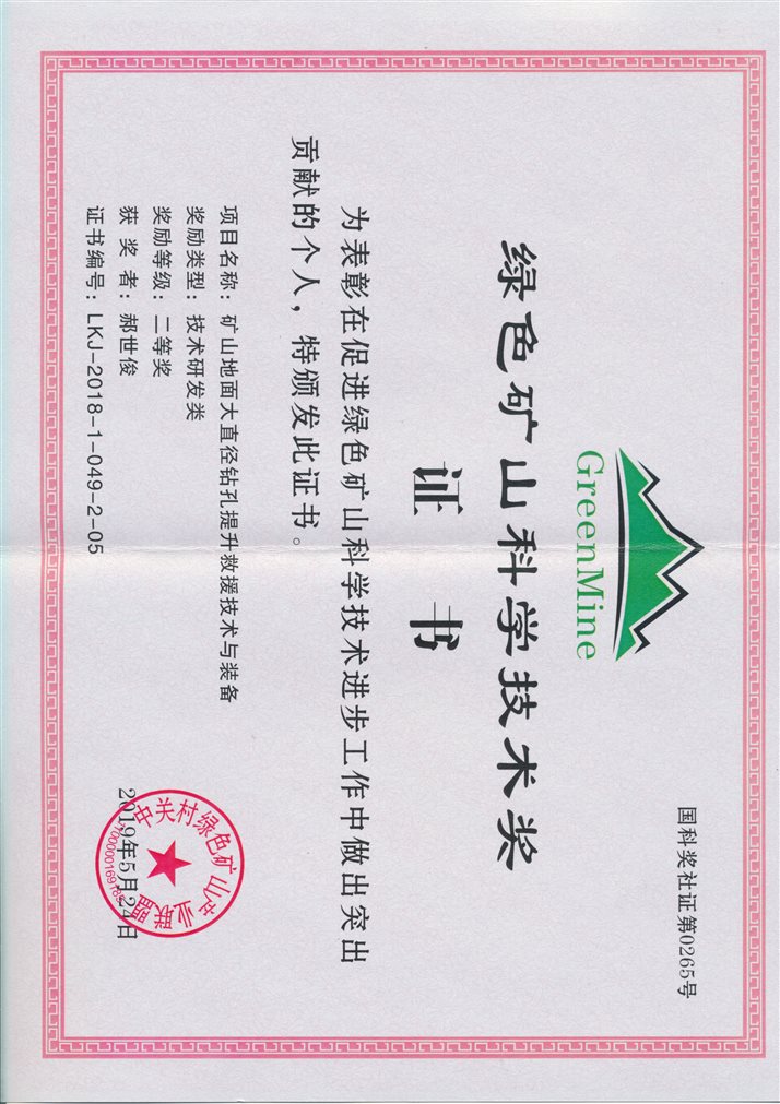 (11)矿山地面大直径钻孔提升救援技术与装备,中关村绿色矿山产业联盟,绿色矿山科学技术进步奖,二等奖,2019年,排名第5