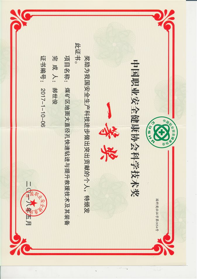 (5)煤矿区地面大直径孔快速钻进与提升救援技术及其装备,中国职业安全健康协会,中国职业安全健康协会科学技术奖,一等奖,2017年,排名第6