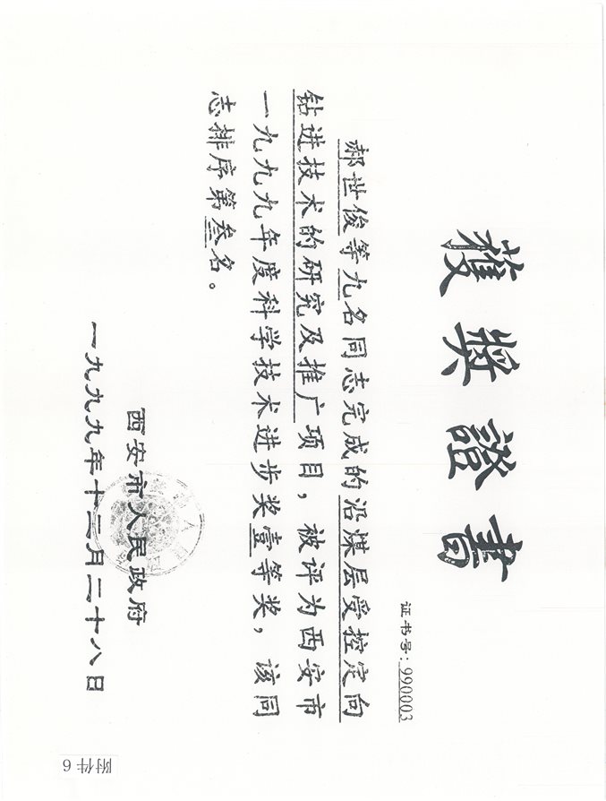(9)沿煤层受控定向钻进技术的研究及推广,西安市,西安市科学技术进步奖,一等奖,1999年,排名第3