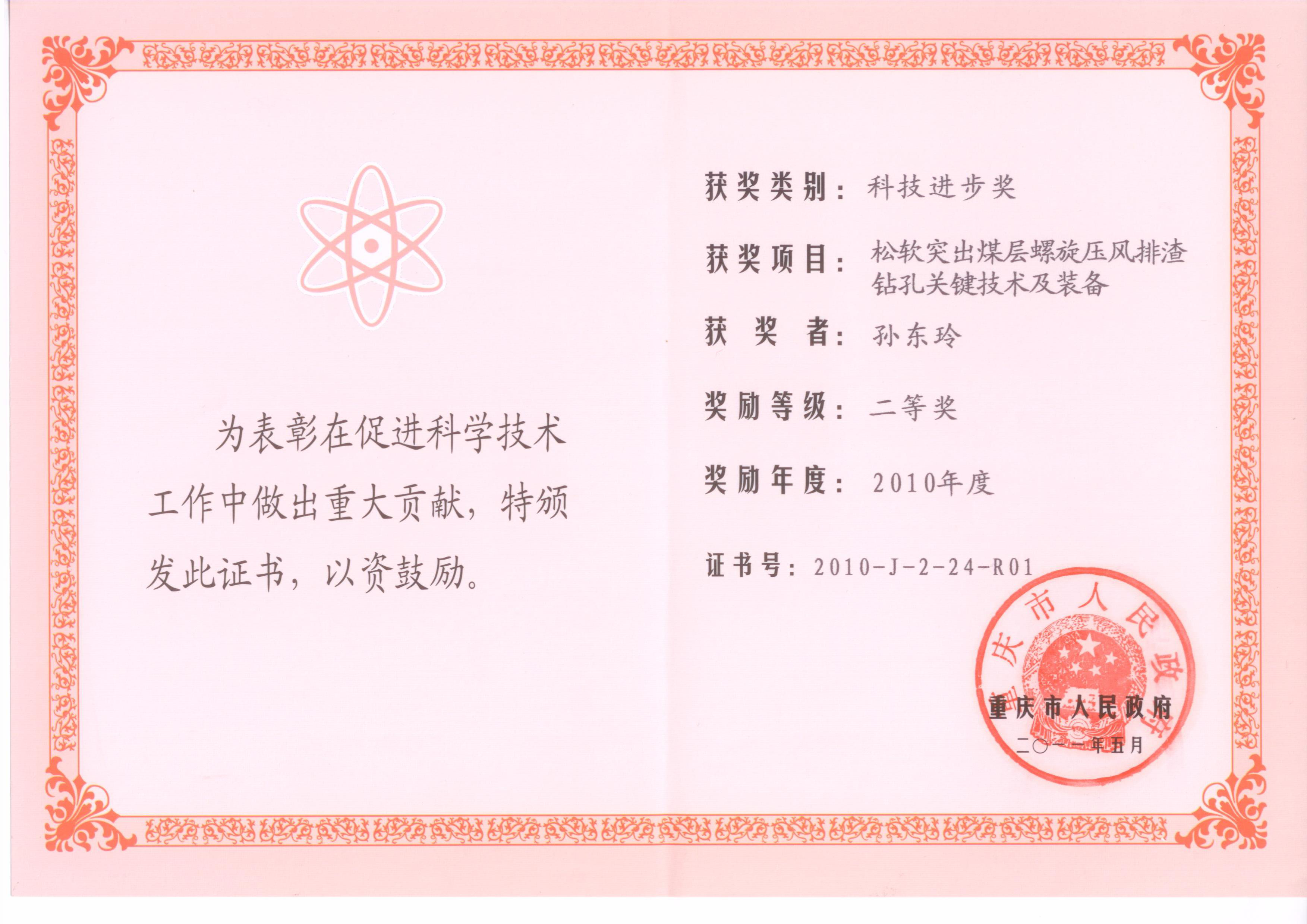 [6]2010年“松软突出煤层螺旋压风排渣钻孔关键技术及装备”获重庆市科技进步奖二等奖