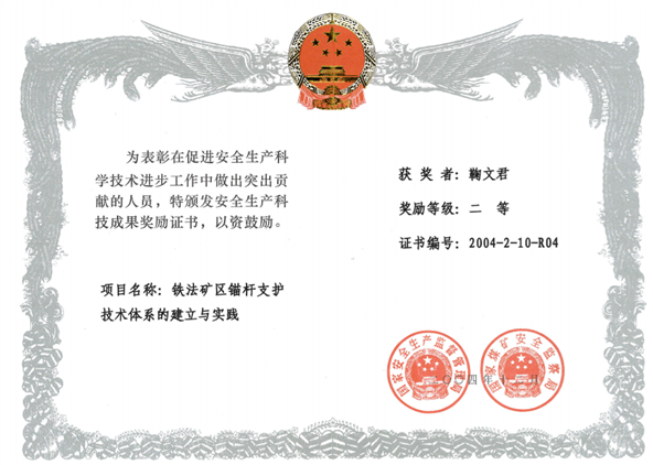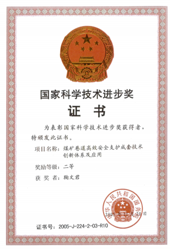 1、煤矿巷道高效安全支护成套技术创新体系及应用,国家科技进步二等奖,2005,排名10;