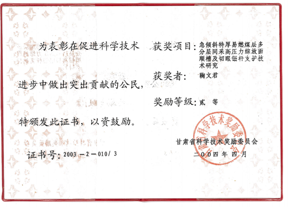 9、急倾斜特厚易燃煤层多分层同采综放面顺槽及开切眼支护技术研究,甘肃省科技进步奖二等奖,排名3;