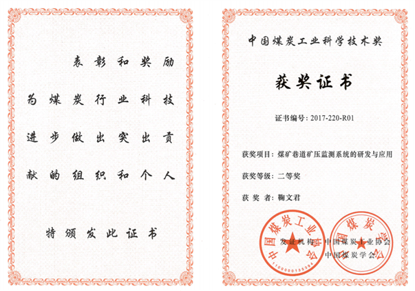 4、煤矿巷道矿压监测系统的研发与应用,中国煤炭工业科学技术奖二等奖,2017,排名1;