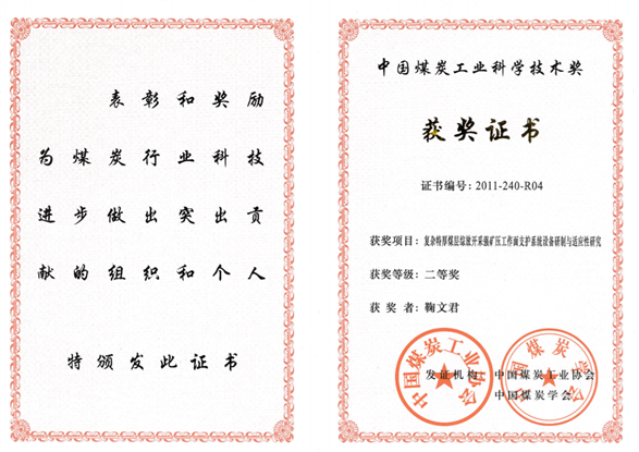 6、复杂特厚煤层综放开采强矿压工作面支护系统设备研制与适应性研究,中国煤炭工业科学技术奖二等奖,2011,排名4;