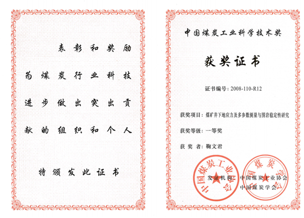 3、煤矿井下地应力及多参数测量与围岩稳定性研究,中国煤炭工业科学技术奖一等奖,2008,排名12