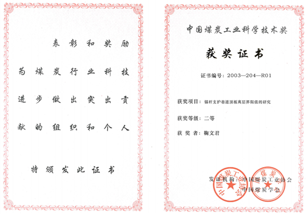 8、锚杆支护巷道顶板离层界限值研究,中国煤炭工业科学技术奖二等奖,2003,排名1;