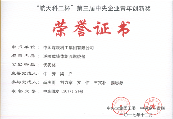 2.逆喷式钝体旋流煤粉燃烧器,“航天科工杯”第三届中央企业青年创新奖,2017年,中企团发[2017]21号,排名第1。