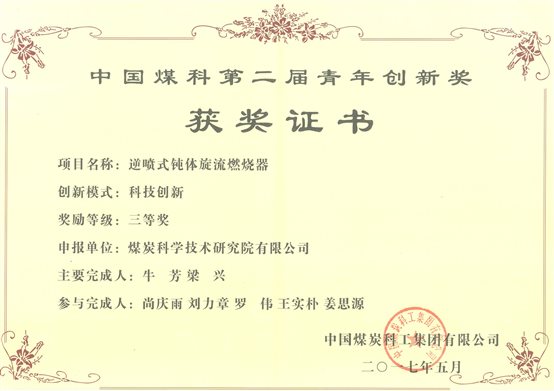 1.逆喷式钝体旋流低氮燃烧技术,中煤科工集团科技成果奖一等奖,2019,排名第1。
