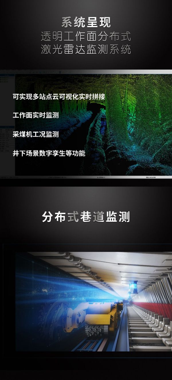该套系统系统秉持激光雷达阵列并行监测、动态拼接、实时建模、精细孪生的新理念,解决了开采过程中工作面探查不清楚、模型更新不及时的问题,满足了煤矿井下透明工作面建设中测量范围广、环境/结构复杂度高和数据高精度的实际需求,为工作面的智能化和无人化开采提供数据支撑。