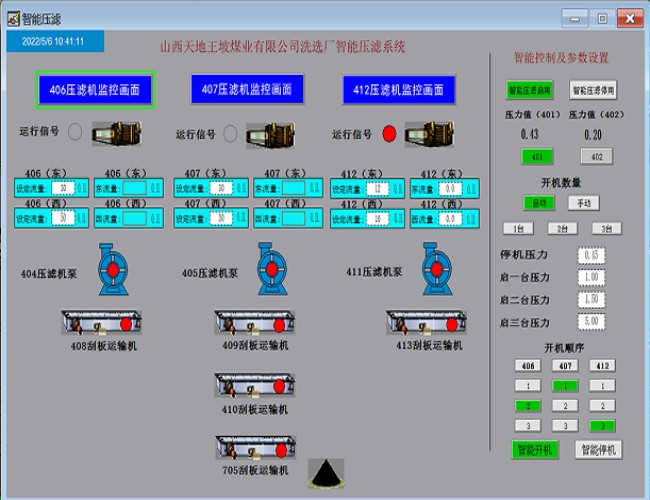 智能压滤系统是基于专家知识的控制算法,实现自动统筹压滤、自动结束进料、多台压滤机自动排队进料卸料及系统安全闭锁的综合性控制系统,通过对滤液水流量进行检测,将集控系统与压滤系统的对接,配备专用移动客户端,实现了煤泥压滤全过程的无人化控制和手机APP远程监控,在国内首次实现采用压滤效果检测手段实现煤泥压滤环节的智能控制,降低了人员需求,提高生产效率,实现压滤系统自动统筹生产,解决了煤泥压滤环节的智能化难题。