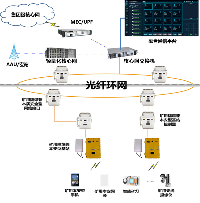 研制了矿用隔爆兼本安型基站控制器和基站、矿用本安型手机和网关、矿用隔爆兼本安型网络接口,形成了一套矿用5G无线通信系统。
