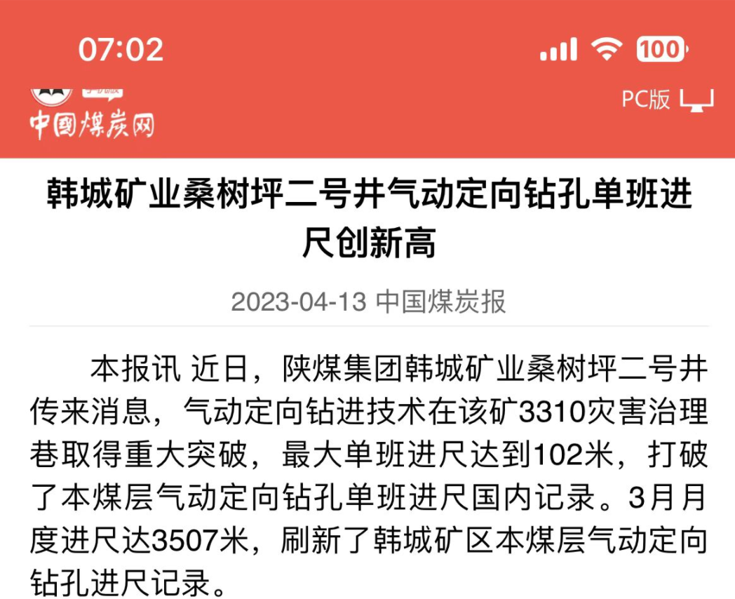 桑树坪二号井煤矿矿防突负责人表示,新的纪录令人振奋,气动定向钻进技术解决了桑树坪矿碎软煤层长距离钻孔成孔难题,实现了瓦斯超前、精准抽采治理,有效缓解了掘、抽矛盾,为煤矿安全高效生产提供了技术保障,为韩城矿区瓦斯治理提供了新模式、新思路、新方法。桑树坪矿方表示,将进一步加强与西安研究院的科研合作,不断提升矿井瓦斯抽采治理水平。